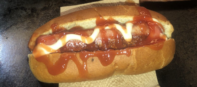 Una salchicha enrollada en tocino, dentro de un pan, aderezada con cebolla, catsup y mayonesa.